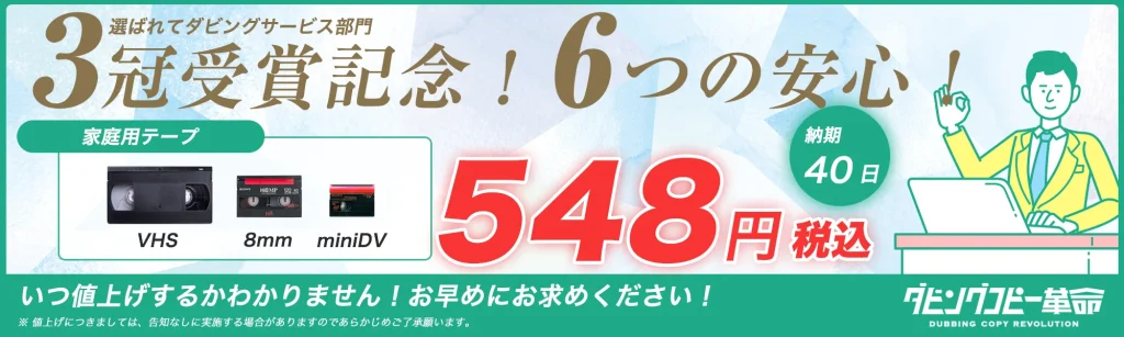 安くても品質が悪い、、、大切なビデオテープが画質の悪いDVDになってしまうこともあります。ダビングコピー革命のようにダビングサービス部門でNo.1評価の実績がある業者を選定しましょう。